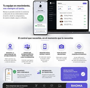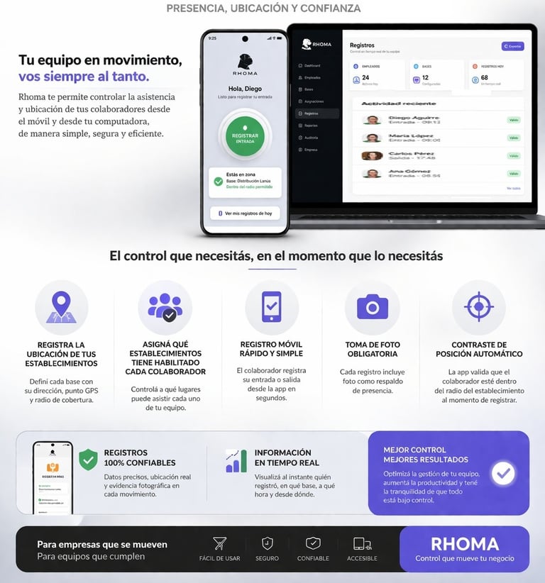 Rhoma registra ubicación, foto y asistencia en tiempo real desde el celular.
